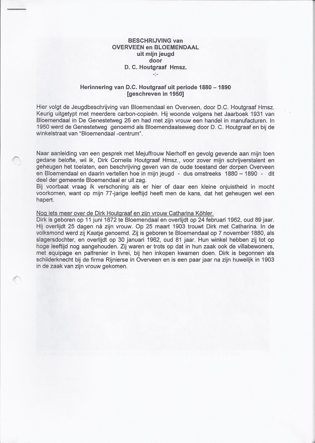 Jeugdherinneringen aan Bloemendaal en Overveen van D.C. Houtgraaf uit de periode 1880 – 1890.