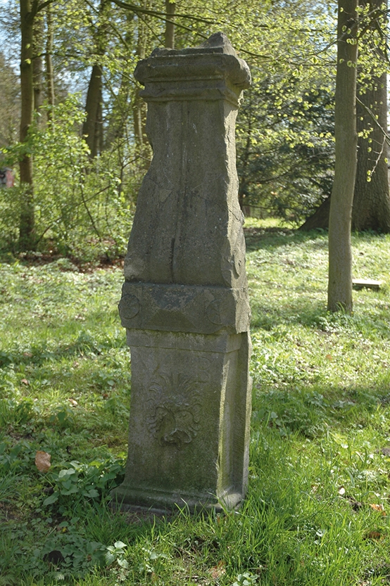 De hergebruikte natuurstenen stoeppaal uit het einde van de 16de eeuw is voorzien van een leeuwenmasker en het opschrift V B.